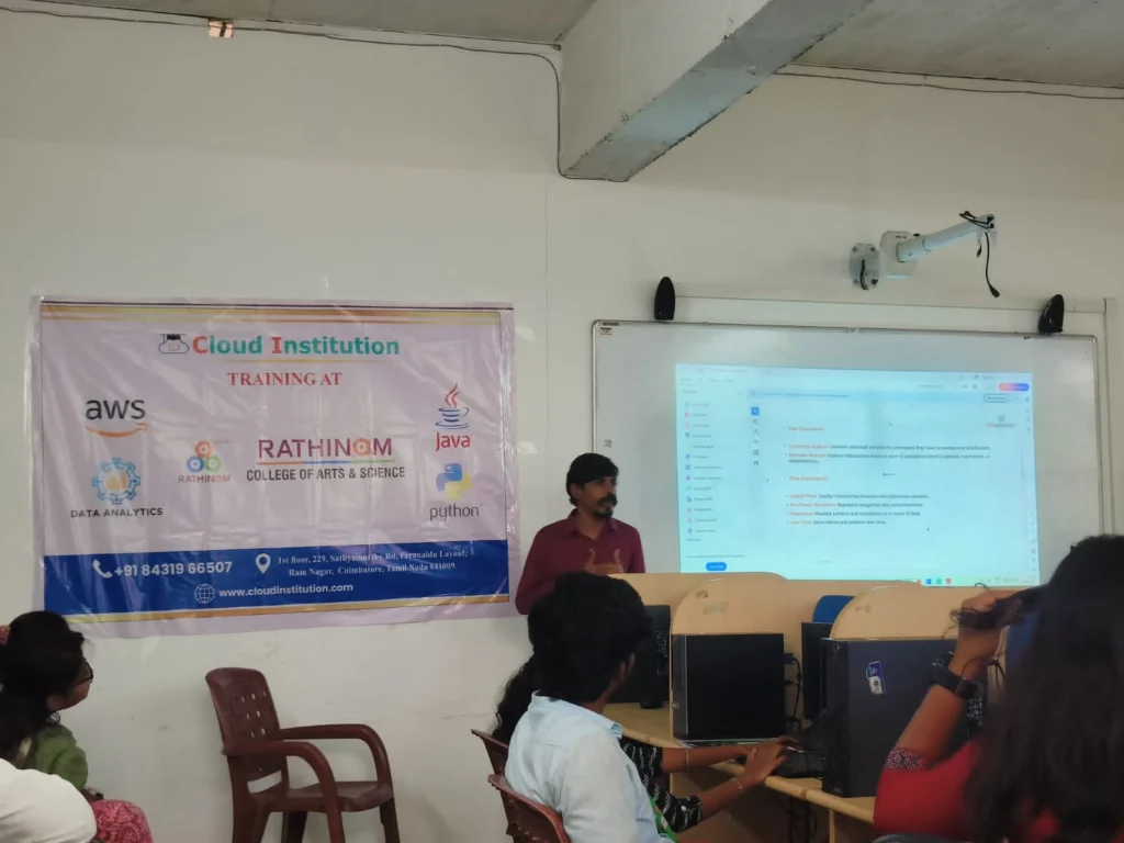 The interactive workshop sparked engaging discussions and encouraged active participation. We also highlighted the growing career opportunities in cloud computing. We thank the faculty and students of Rathinam College of Arts and Science, Coimbatore for their enthusiastic involvement and support in making the workshop a successful and enriching experience.